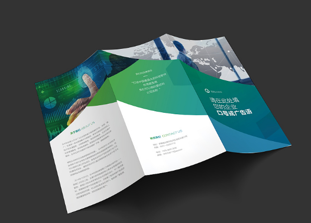 三折页的广告标语用简短的一句话来概括三折页内容,如企业的发展方向或主导产品;三折页的形象照片需要根据行业和产品属性来确定;三折页内容的文字部分,如企业名称、产品名称、产品描述、企业标语、企业简介和联系方式等可以根据市场需求设计成中文和英文两个版本。