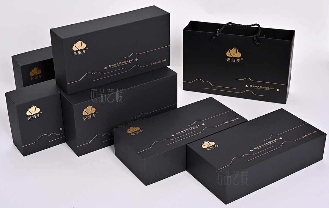 匠品艺栈以精湛的包装定制规划方式,将普洱茶的深邃黑色作为该产品的灵魂色彩,
