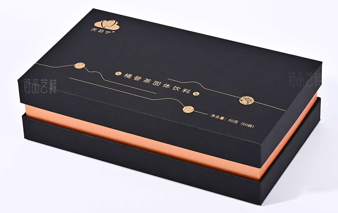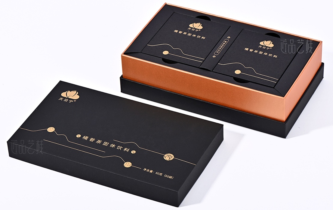 依托a级黑色卡纸为包装盒主体,点辍精致烫金工艺,